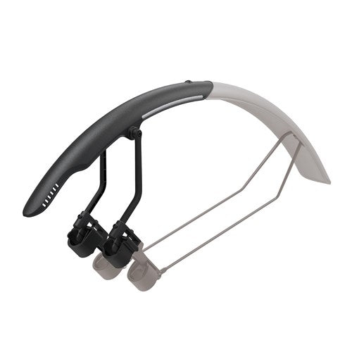 The perfect quick-mount, dual color front fender that attaches to road bike forks with hook and loop straps easily and securely. Adjustable struts provide a closer fit to the tire and excellent mud / spray protection while the highly polished underside helps prevent dirt buildup and aids in cleaning. Included 3M reflective decals provide safety at night.