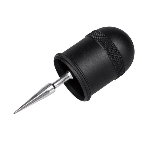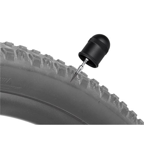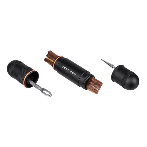A minimalist tubeless tire repair kit stores inside a machined alloy pod. The repair tools are integrated into the pod end caps that feature knurled surfaces delivering extra grip when repairing tire.