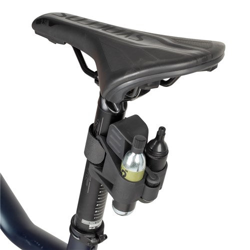A compact frame tube mount, tire repair and CO2 inflation kit features Nano AirBooster CO2 inflator, TubiCartridge MT25, one 25g CO2 cartridge, knife, and Mini 9 Pro folding tool for MTB. Included mounting module with grip strap allows the TubiMaster MXT to be attached to a seatpost or seat tube with ease