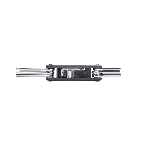 11 function folding tool that can easily handle most repairs. Perfect for everyday cycling. Updated design to secure 8 mm hex tool bit. Included a self-tightening T20 / 2.5mm L-type wrench.