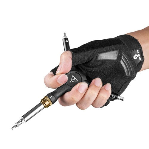 A 3-way pro quality, ratchet tool and 4/5mm hex wrench with high tensile strength for better wear resistance, extended tool life and provides excellent leverage and usage. Generous 30mm bit length makes it easy to reach tough bolt locations and knurling prevents fumbling when changing bits or removing bits from the organizer. Built-in speed sleeve adds speed with efficiency.