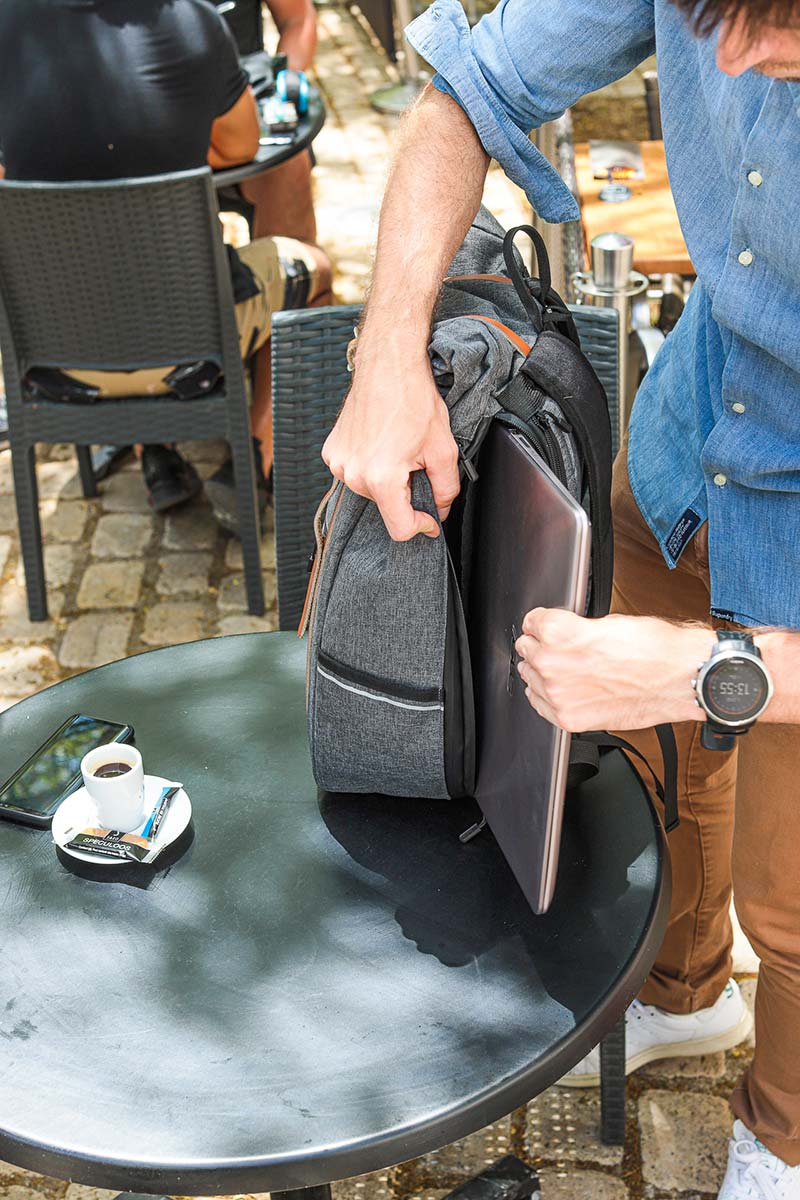 Durable and practical, it has been designed to hold a laptop (15”) and/or a large volume of belongings. A roll-up closure with leather straps provides access to the main compartment which is also accessible through a side opening for easy access to the laptop. The bag is equipped with an additional interior storage compartment and a small exterior front pocket with a waterproof zip. On one side, the straps allow you to carry a U-lock. Underneath the bag, an elastic rain cover is stored and can be unrolled and protect the bag in case of rain. Finally, the chest strap is adjustable height wise for greater comfort.