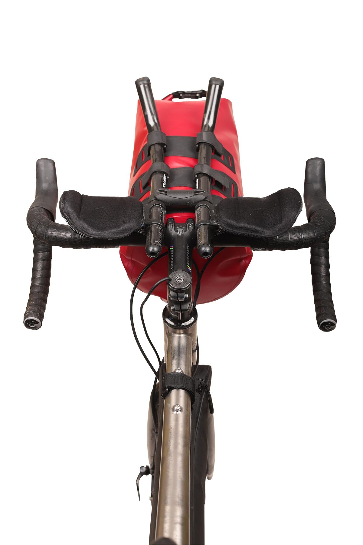 This waterproof front bag is to be installed on aerobars. It is ideal to increase considerably the storage space on your bike. It does not clutter up the cockpit or disrupt your aerodynamics. Its large capacity will allow you to carry light and bulky items, such as your bivouac equipment or spare clothing. It is easy to install and remove thanks to the self-gripping straps. Light and robust, available in two versions 8L or 12L, it will be a first choice ally during your ultra cycling events or for bikepacking, whatever the weather conditions. It also has reflective strips for better visibility at night.